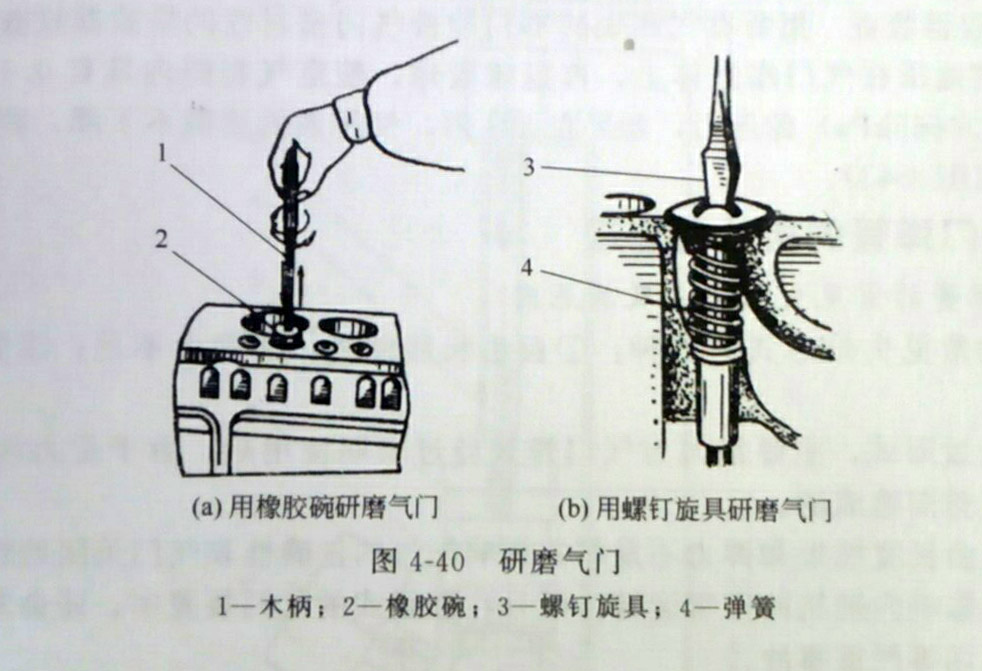 3、用橡膠碗吸住氣門頭,使柴油發(fā)電機組氣門往復(fù)旋轉(zhuǎn)進行研磨,如圖4-40(a);若沒有橡膠碗,氣門頂有凹槽的,可在氣門桿上套一根軟彈簧,用螺釘旋具進行研磨,如圖4-40(b)。